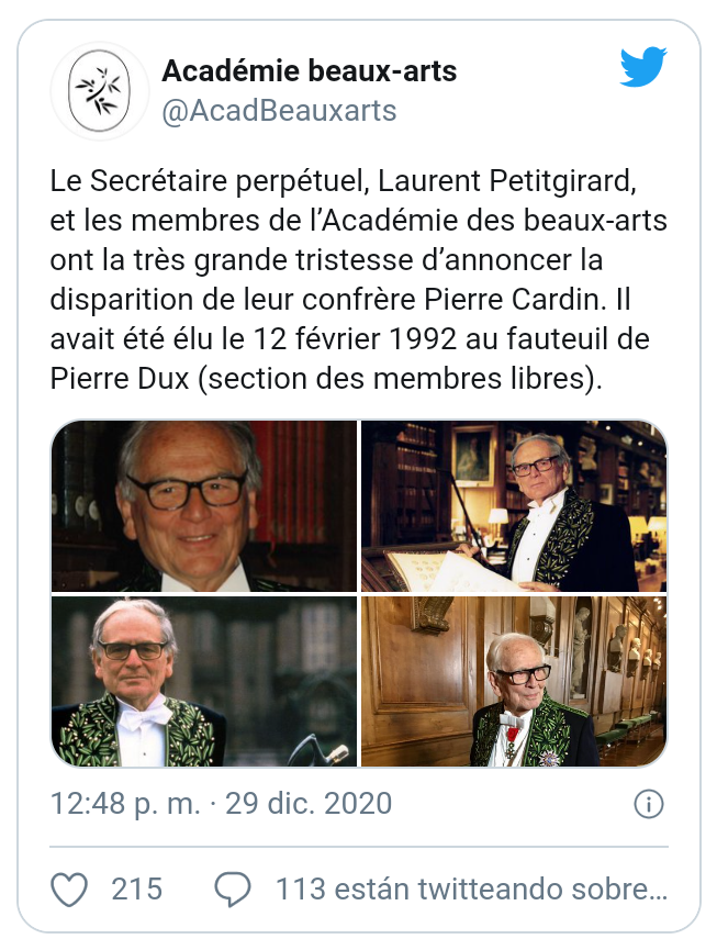 "Es un día de gran tristeza para toda nuestra familia, Pierre Cardin ya no está. El gran modisto que fue, cambió de siglo, dejando a Francia y al mundo un patrimonio artístico único en la moda pero no solo eso", reza un comunicado. "Todos estamos orgullosos de su tenaz ambición y de la audacia que mostró a lo largo de su vida".